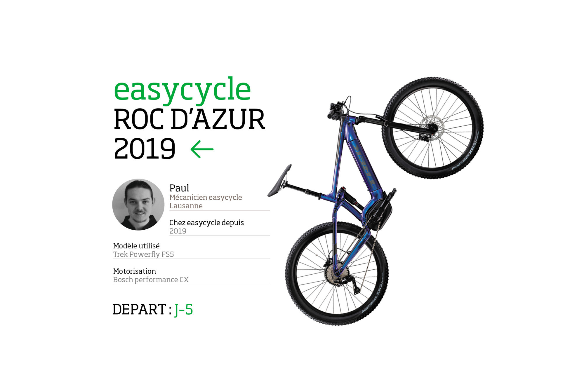 « J'ai choisi le Powerfly FS5 de Trek, une bécane bien équipée, mais accessible malgré tout, et qui a largement fait ses preuves avec son moteur Bosch. C'est une valeur sûre, puisque le modèle existe depuis maintenant cinq ans, une vraie marque de référence dans le milieu. »